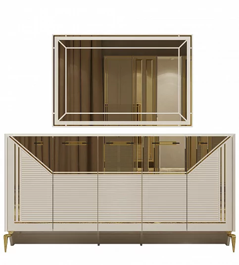 Фрезерованные фасады с изысканной золотой вставкой придают комоду утонченный и роскошный вид, делая его настоящим украшением вашего интерьера. Зеркало бронзового оттенка добавляет глубины и тепла, отражая свет и визуально расширяя пространство.