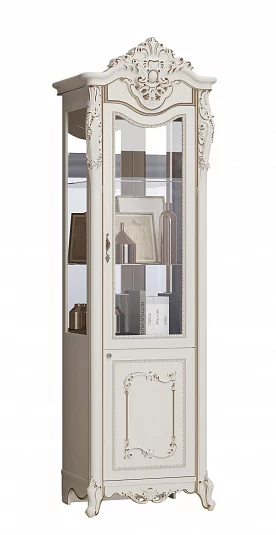 Пенал "Джоконда"  - благородная одностворчатая витрина с двумя отделениями: верхним - витринным, с двумя стеклополками и панорамным остеклением, и нижним - с полкой за распашной дверцей. Пенал выполнен в стиле барокко, богато декорирован патинированной золотом лепниной и изящной резьбой.