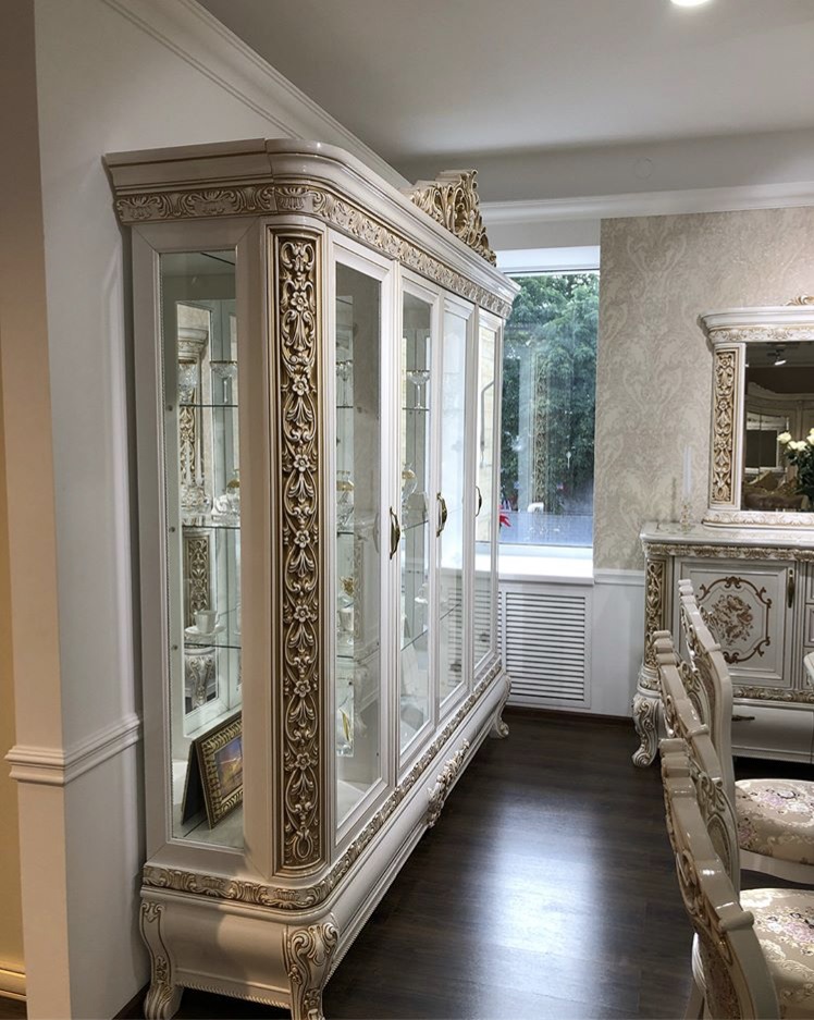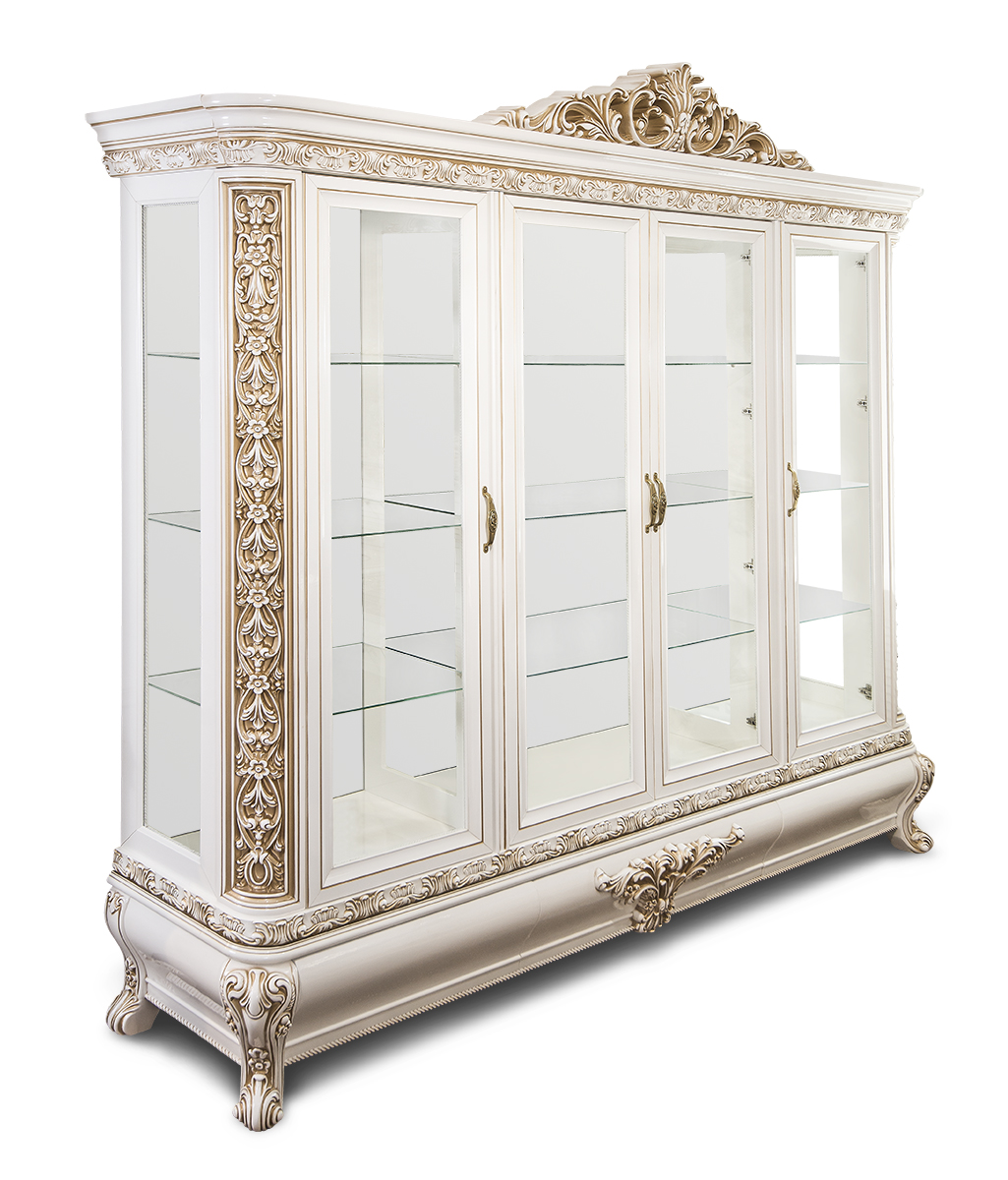 Фасад: МДФ с каскадной фрезеровкой, патина золотая, перламутровый глянцевый лак;