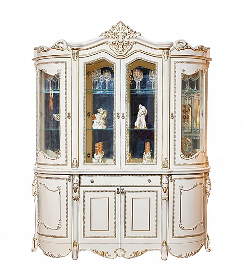 Витрина 4 дверная "Джоконда" выполнена в стиле барокко, где под лепным карнизом расположены витринные отделения с прямыми и гнутыми фасадами. Нижние отделения для хранения с полкой за "глухими" распашными дверцами. Витрина богато декорирована патинированной золотом лепниной и изящной резьбой.