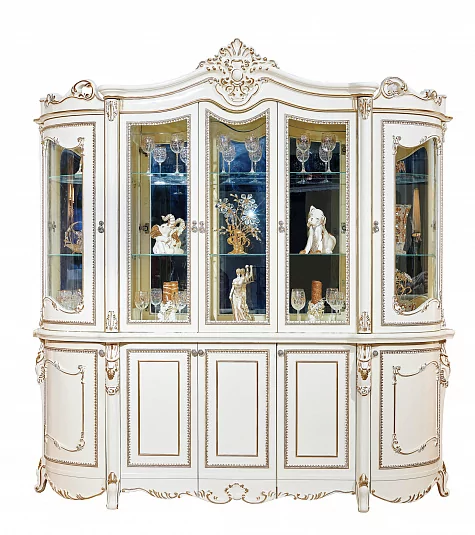 Витрина 5 створчатая "Джоконда" выполнена в стиле барокко, где под лепным карнизом расположены витринные отделения с прямыми и гнутыми фасадами. Нижние отделения для хранения с полкой за "глухими" распашными дверцами. Витрина богато декорирована патинированной золотом лепниной и изящной резьбой.