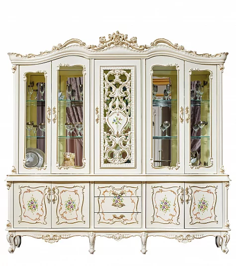 Центральная часть витрины украшена уникальным резным узором, придающим ей особый шарм. Высоко-глянцевое покрытие фасадов изящной изогнутой формы в совокупности с нежным рисунком выделяют коллекцию "Шанель" и делают её узнаваемой. Боковое остекление наполняет витрину светом, добавляя теплоту и уют в окружающее её пространство.