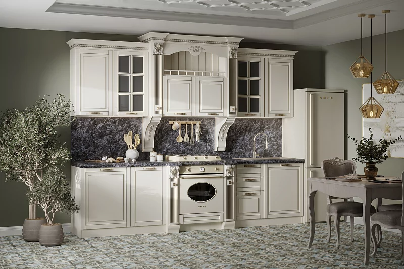 Кухня "Камелия" в классическом стиле сочетает роскошь классики с современной практичностью. Изящные фасады с фрезеровкой, подчеркнутой патиной оттенка "Шампань", способны создать поистине неповторимую обстановку на вашей кухне.