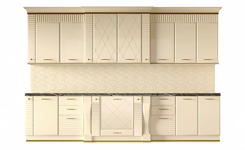 Киара – кухонный гарнитур, выполненный в стиле ар-деко. С первого взгляда мебель покоряет своей изысканностью и утонченностью, которая гармонично соединена со строгими линиями фасадов и оригинальным геометрическим декором. Кухня выполнена в цвете «слоновая кость» с глянцевыми фасадами из эмалированного МДФ. Дополняют изысканный образ мебели золотистые линии и внешняя фурнитура. Модуль под духовой шкаф и варочную панель стилизован под каминный портал, что придает кухне эффектный и нестандартный вид.