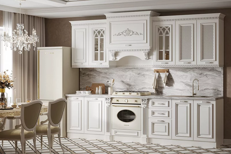 Каждая кухня модели Монако уникальна по-своему: бутылочницы, цветовая палитра, оформление колонн, разные вариации порталов, – всё это позволяет удовлетворить потребности каждого.