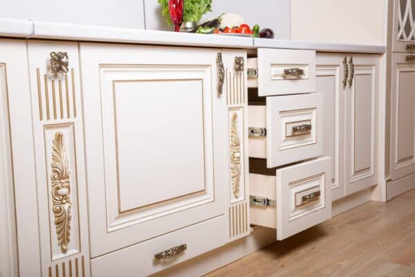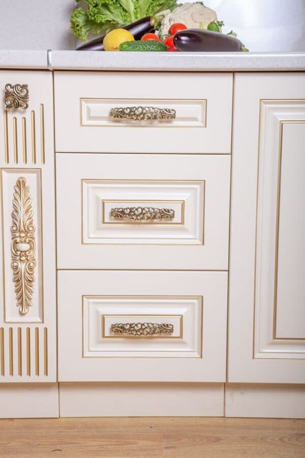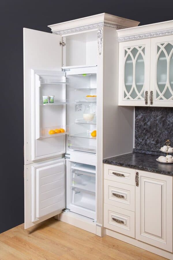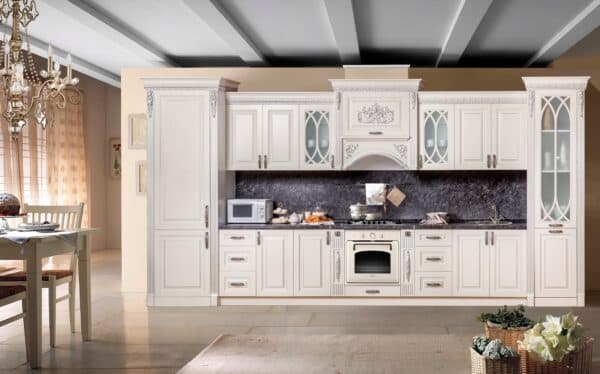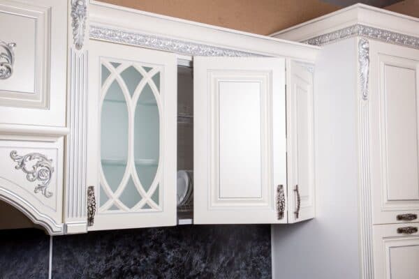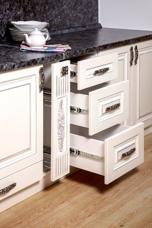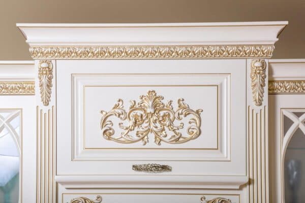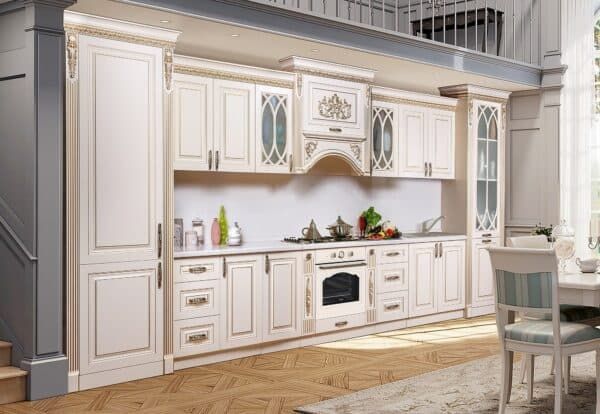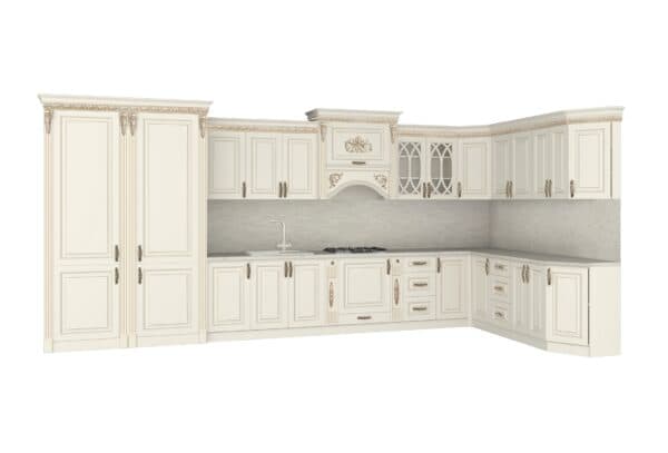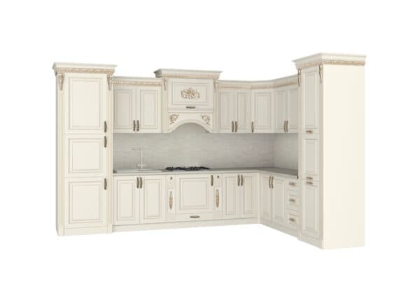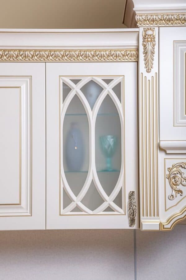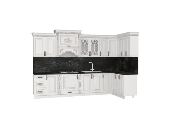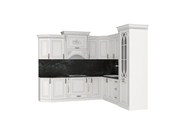 Фасад: прямой, крашеный ЛМДФ толщиной 19мм с фрезеровкой и элементами декора, лак матовый, карниз из пенополиуретана