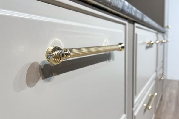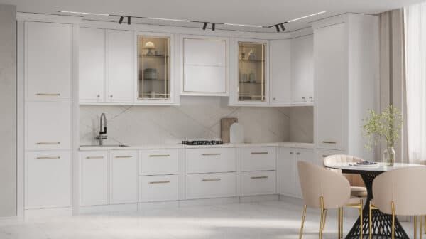 Угловая кухня «Рафаэлла»— сдержанная классика для просторных интерьеров. Доступна в теплом «кашемире» (кофе с молоком) или элегантном белом. Фасады из матового ЛМДФ с филигранной фрезеровкой создают благородную фактуру, а золотые ручки со стразами добавляют деликатный блеск. Идеально впишется вар-деко или современную классику.