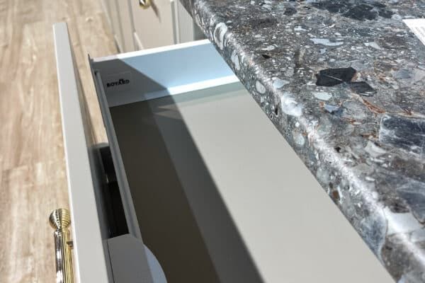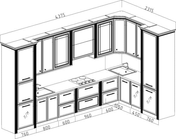 Практичность продумана до мелочей: влагостойкая столешница 38 мм («Брекчиа антика»/«Пирит светлый»), усиленные доводчики SKMF и удобные метабоксы Boyard под варочной панелью. Глубина 634 мм обеспечивает комфорт при готовке, а угловая компоновка экономит пространство без потери стиля. Лаконичная элегантность в каждой детали.