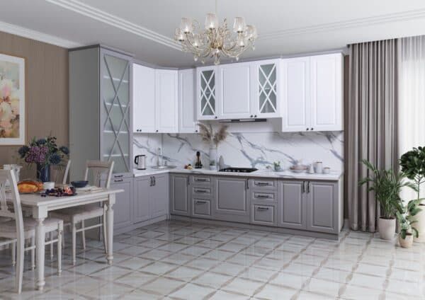 Угловая кухня «Виктория» в элегантном дуэте «Седая ночь»— идеальное сочетание белого и серого для создания утонченной атмосферы. Ее лаконичные линии и матовая эмаль фасадов (ЛМДФ с фрезеровкой) органично впишутся всовременный, скандинавский или минимализмстиль, привнося ощущение простора и порядка.