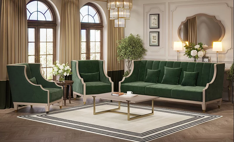 Набор мягкой мебели из коллекции София - это идеальное сочетание стиля, комфорта и природной гармонии. Он привносит свежесть и естественность в ваш интерьер, создавая атмосферу умиротворения и релаксации. Мебель изготовлена с использованием высококачественных материалов, обеспечивая долговечность и комфорт. Комплект включает в себя удобный диван и кресла, которые обеспечивают максимальный уровень комфорта и поддержки для вашего отдыха. Зеленый цвет ткани придает мебели свежий и природный вид, создавая ощущение гармонии с окружающей средой.