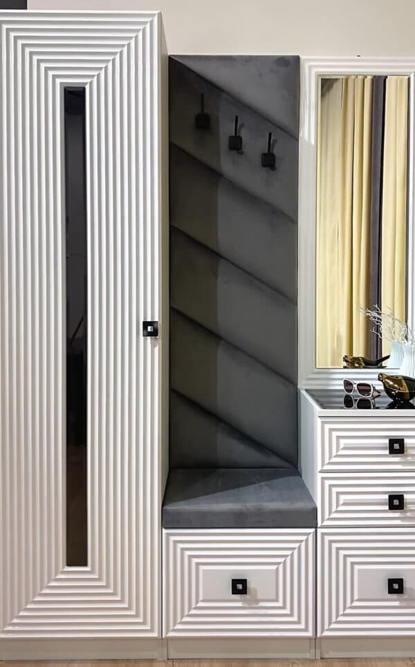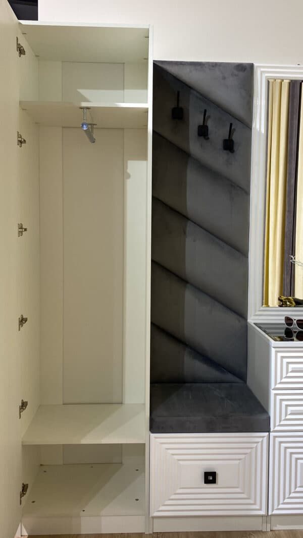 Современная прихожая в стиле арт-деко с геометрическими фасадами, золотой фурнитурой и мягкой панелью глубокого синего цвета. Вместительный шкаф, удобные ящики и зеркало обеспечивают комфорт и функциональность. Контрастные оттенки, строгие линии и изысканные детали создают стильный и уютный интерьер. Идеальное решение для тех, кто ценит элегантность и практичность.