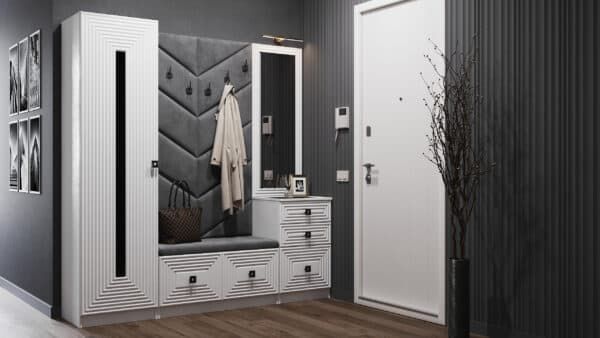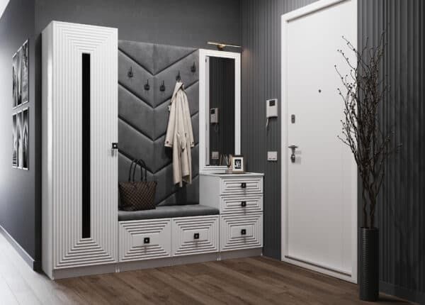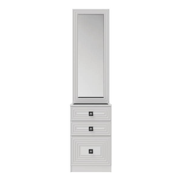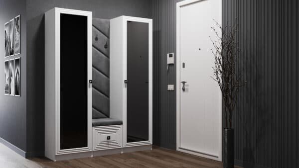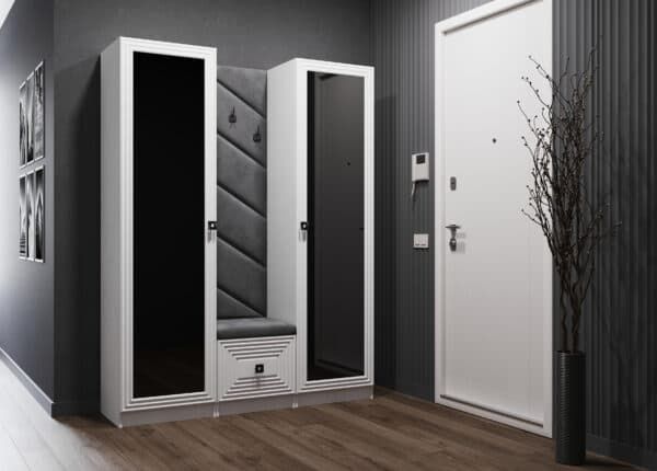 Размеры: Шкаф зеркальный – ш: 550 мм, г: 450 мм, в: 2100 мм Шкаф фрезерованный – ш: 550 мм, г: 450 мм, в: 2100 мм Вешалка 1.0 – ш: 1000 мм, г: 450 мм, в: 2100 мм Вешалка 0.5 – ш: 500 мм, г: 450 мм, в: 2100 мм Комод+Зеркало – ш: 500 мм, г: 450 мм, в: 2100 мм