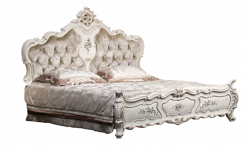 Кровать "Шанель" отличается витиеватыми формами, изогнутыми линиями, цветочным орнаментом в лучших итальянских традициях. Сочетание флористических узоров с роскошной золотой отделкой и мягкой обивкой изголовья кровати дополняют раскошный образ спальни.