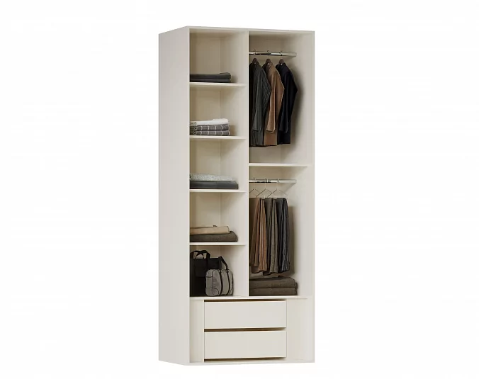 С помощью опции «Комфорт» (приобретается отдельно) можно увеличить полочное пространство (5 дополнительных полок), а также дополнить шкаф двумя выдвижными ящиками. Опция разрабатывалась с соблюдением правильных пропорций, оптимального расстояния между полками, высоты штанги, с которой легко снимать вешалки.