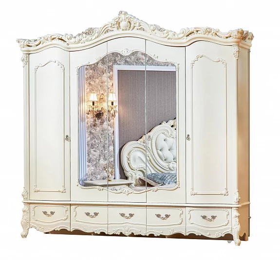 Шкаф 5 дверный "Элиза Люкс" выполненный в классическом стиле. Лепные узоры без патинирования, придают легкость. Удобные выдвижные ящики внизу шкафа создают функциональное удобство.