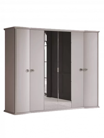 Вместительный 6-ти дверный шкаф "Верона" в стиле "неоклассика" с боковыми гнутыми фасадами и центральными фасадами с зеркалом наполняет интерьер аурой спокойствия, расслабленности и комфорта.
