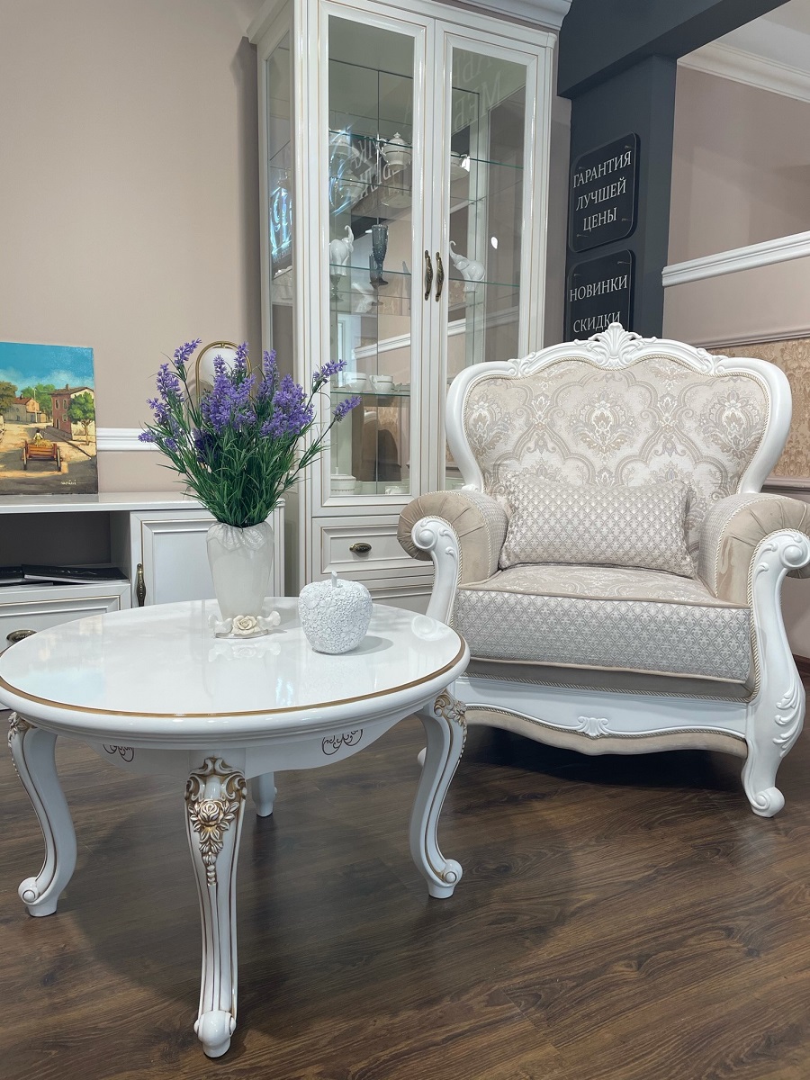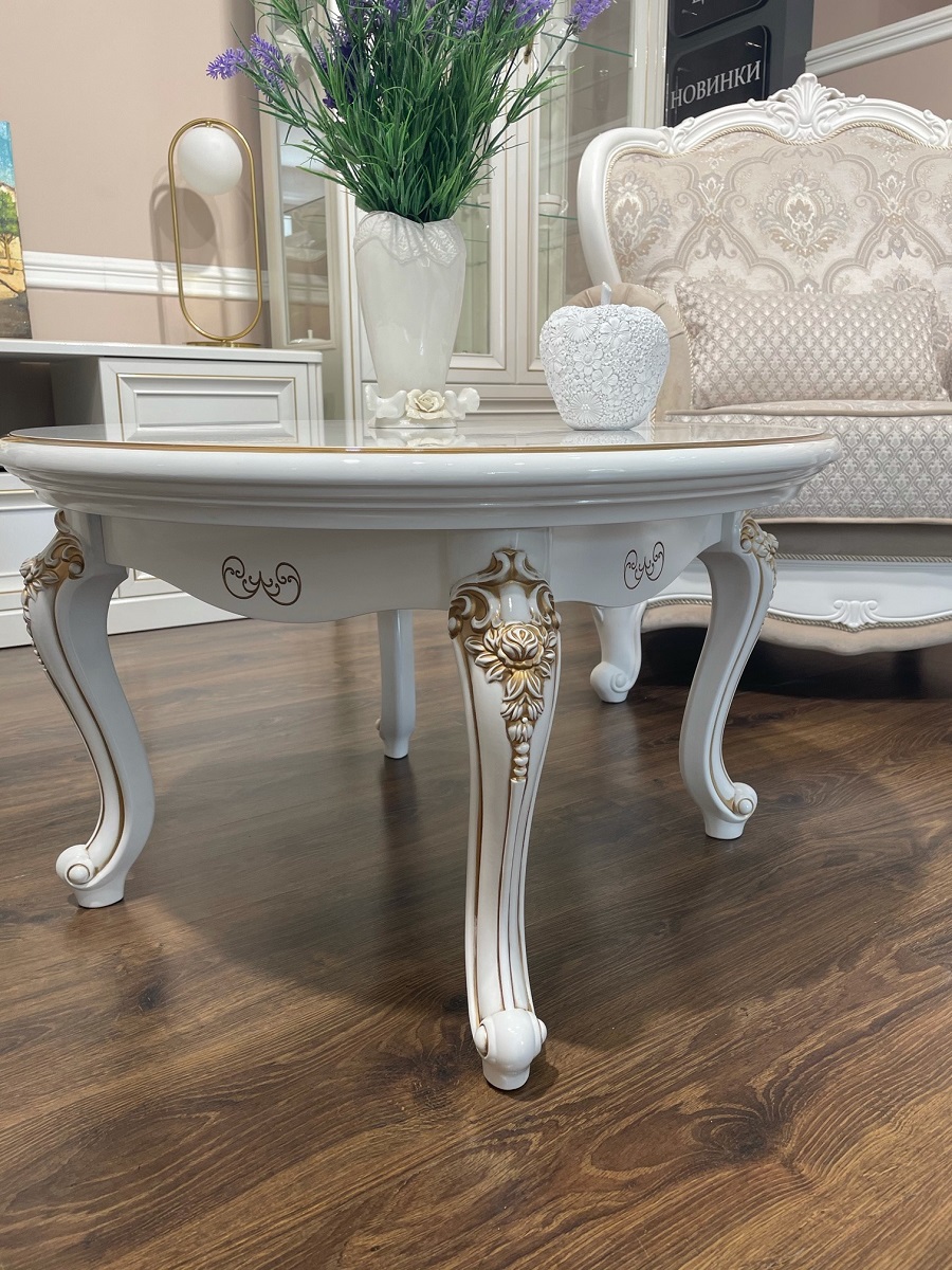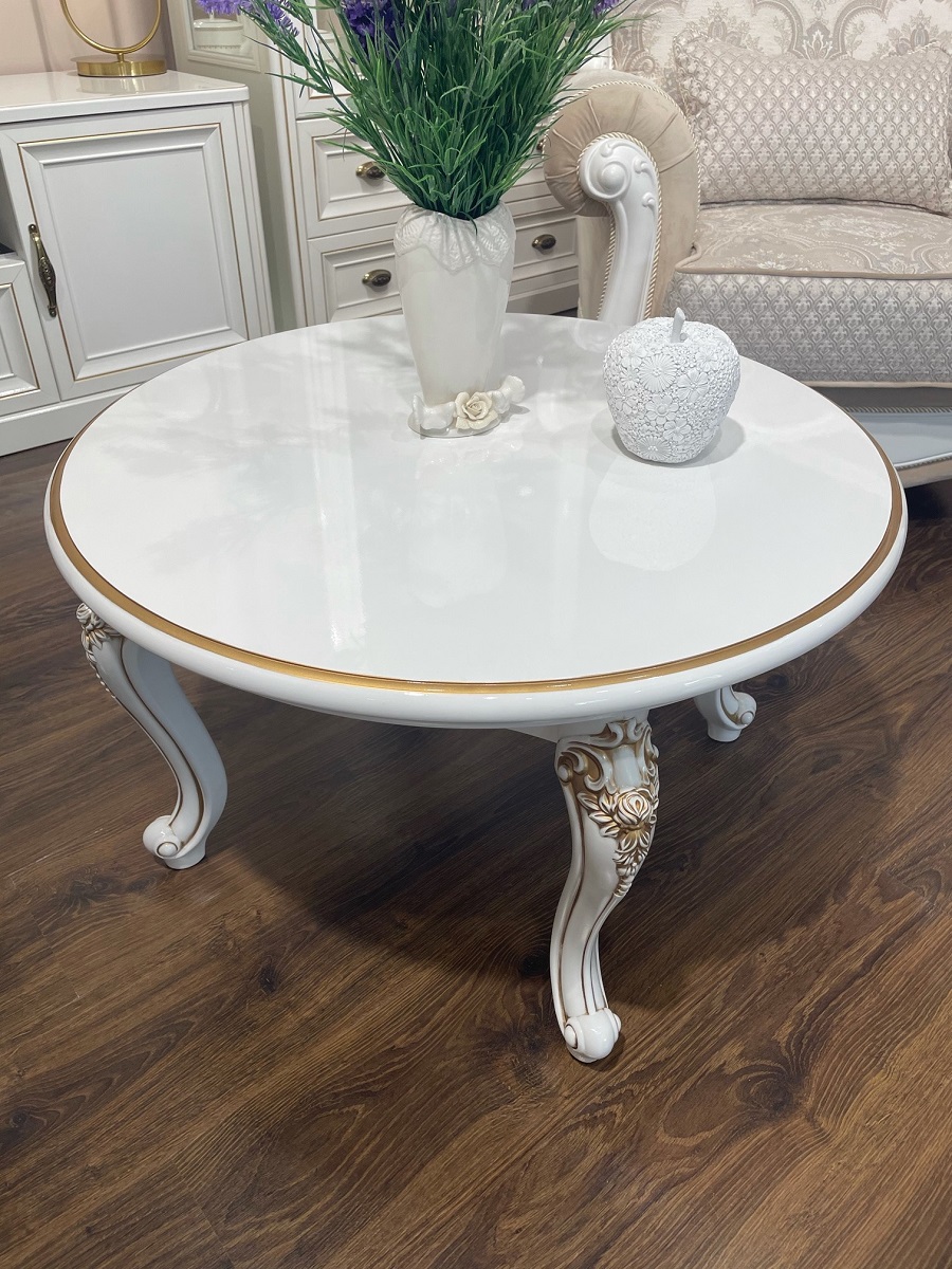 Декор:  Накладное подстолье МДФ с каскадной фрезеровкой, патина золото, глянцевый