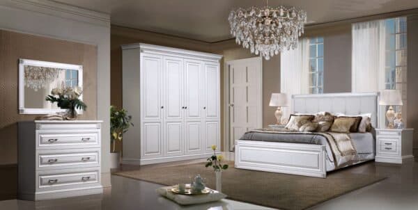 • Размеры: Шкаф 4-х дверный – Ш:2102мм, В:2296мм, Г:651мм Кровать 1.8 – Ш: 1870мм, В:1140мм, Г:2053мм Тумба – Ш:532мм, В:552мм, Г:467мм Комод – Ш:1042мм, В:948мм, Г:467мм Зеркало – Ш:1025мм, В:720мм, Г:20мм