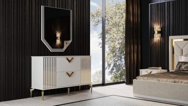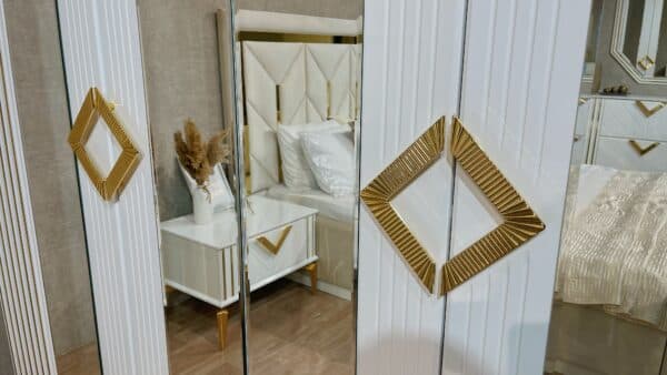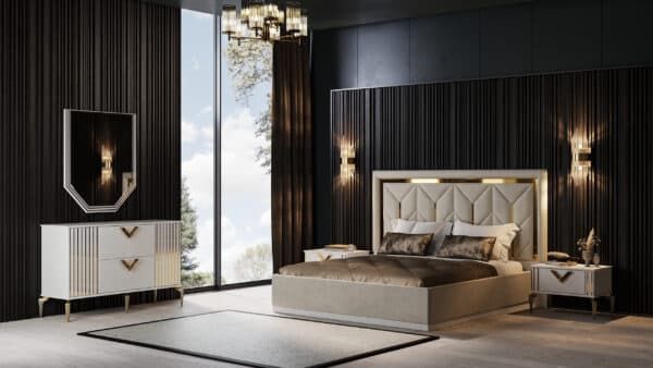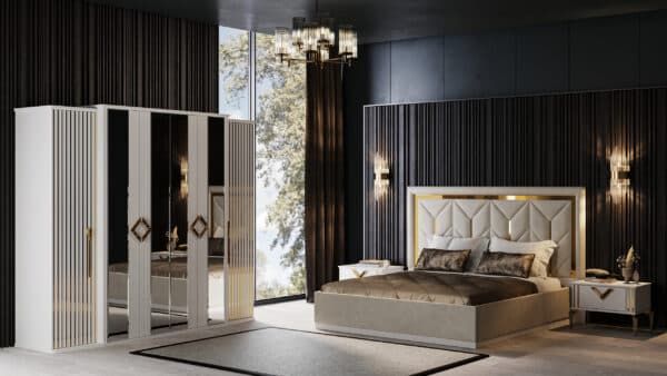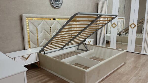 Размеры: Шкаф 6-ти дверный – ш: 2600 мм, г: 650 мм, в: 2200 мм Кровать 1.8 стандарт – ш: 2244 мм, г: 2037 мм, в: 1457 мм Кровать 1.8 с подъемным механизмом – ш: 2244 мм, г: 2037 мм, в: 1457 мм Тумба – ш: 670 мм, г: 450 мм, в: 480 мм Комод – ш: 1426 мм, г: 450 мм, в: 903 мм Зеркало – ш: 900 мм, г: 20 мм, в: 1040 мм