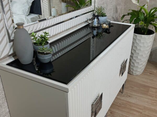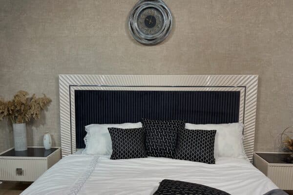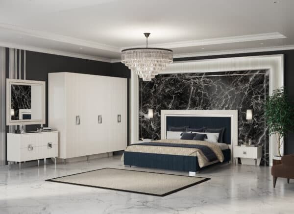 Размеры: Шкаф 6-ти дверный – ш: 2614 мм, г: 603 мм, в: 2300 мм Кровать 1.8 – ш: 2260 мм, г: 2080 мм, в: 1360 мм Тумба – ш: 592 мм, г: 403 мм, в: 482 мм Комод – ш: 1180 мм, г: 442 мм, в: 838 мм Зеркало – ш: 1180 мм, г: 32 мм, в: 1080 мм