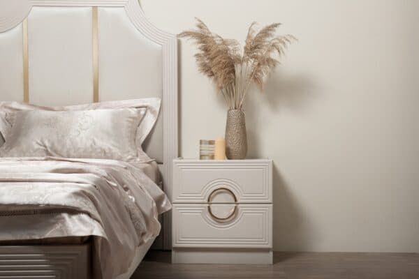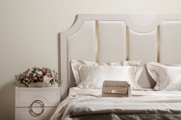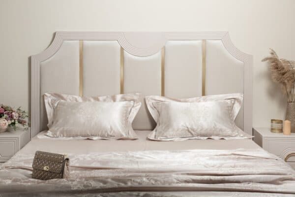 Изголовье кровати: мягкое основание микровелюр бежево-серебристого цвета