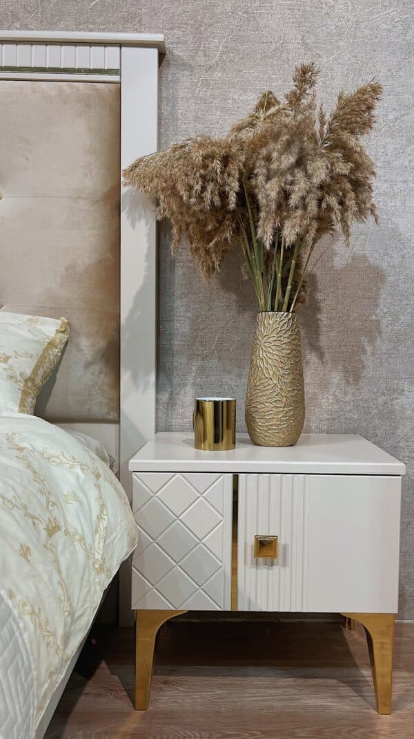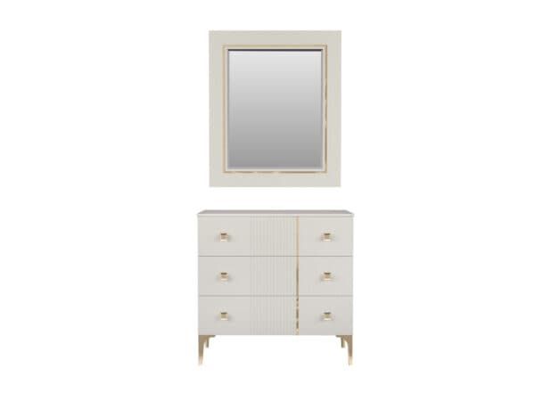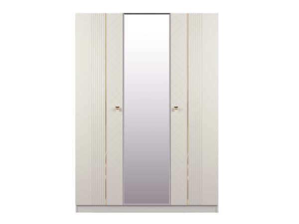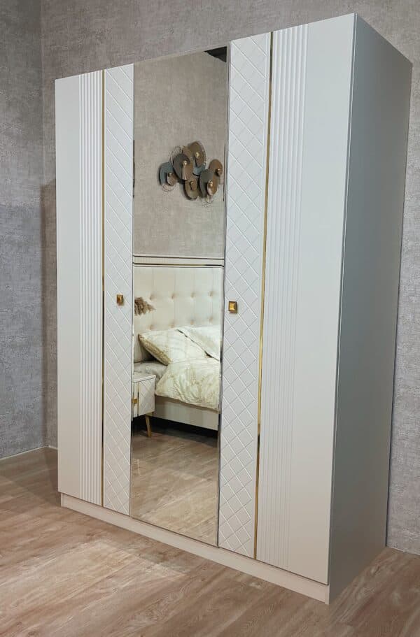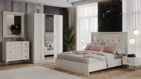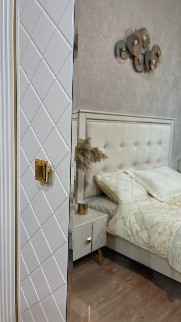 Размеры: Шкаф 3-х дверный – ш: 1500 мм, г: 600 мм, в: 2100 мм Кровать – ш: 1835 мм, г: 2051 мм, в: 1316 мм Тумба – ш: 476 мм, г: 400 мм, в: 416 мм Комод – ш: 960 мм, г: 450 мм, в: 903 мм Зеркало – ш: 886 мм, г: 16 мм, в: 1050 мм