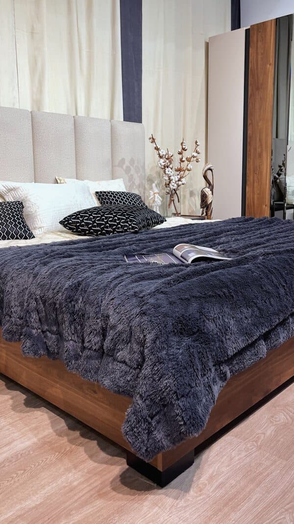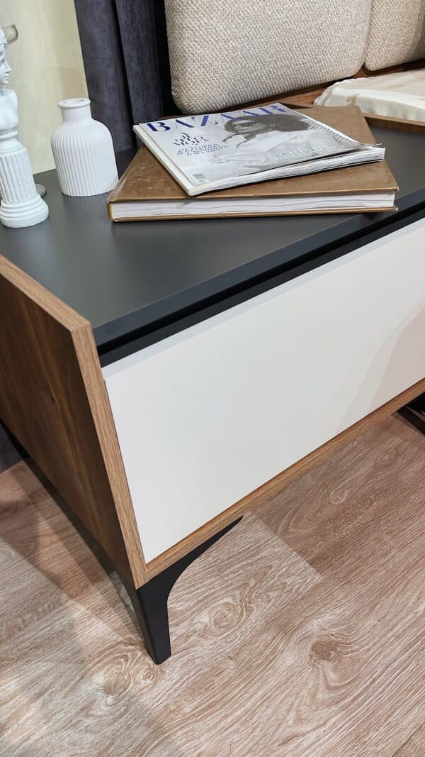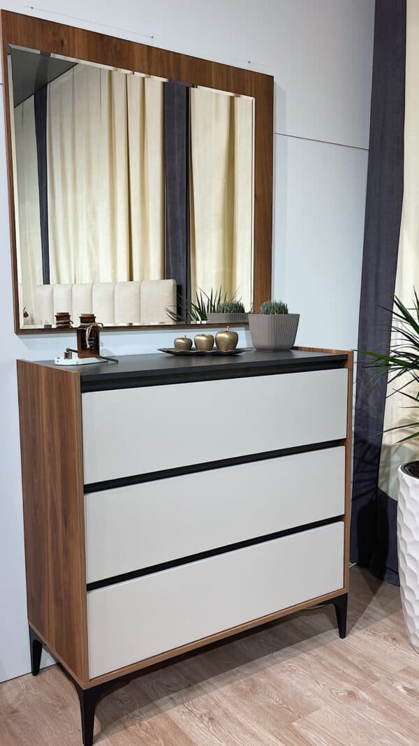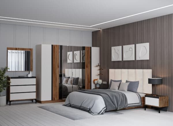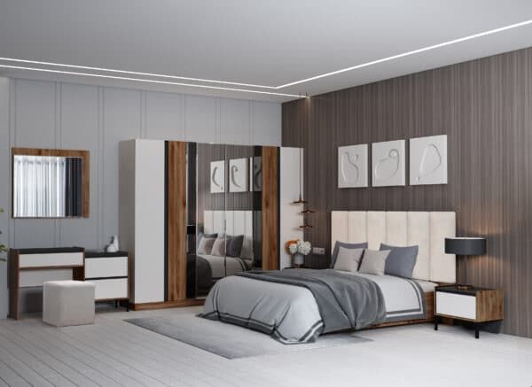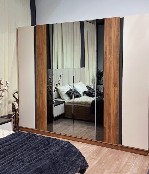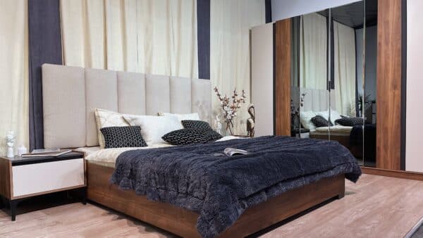 Размеры: Шкаф 6-ти дверный – ш: 2694 мм, г: 606 мм, в: 2250 мм Кровать 1.8 – ш: 2260 мм, г: 2037 мм, в: 1300 мм Тумба – ш: 600 мм, г: 401 мм, в: 480 мм Комод – ш: 1000 мм, г: 430 мм, в: 1014 мм Зеркало – ш: 1000 мм, г: 20 мм, в: 900 мм Пуфик ш: 350 мм, г: 350 мм, в: 430 мм