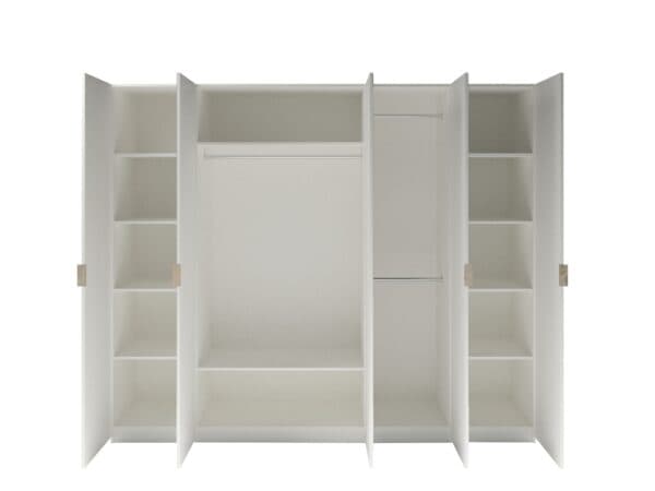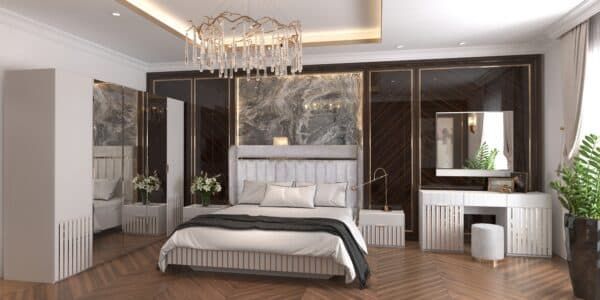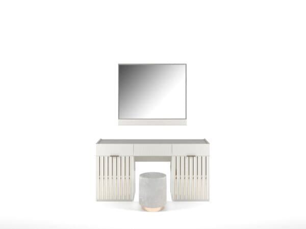 Размеры: Шкаф 5-ти дверный ш: 2500 мм, г: 600 мм, в: 2112 мм Кровать ш: 2050 мм, г: 2050 мм, в: 1390 мм Туалетный столик ш: 1500 мм, г: 470 мм, в: 760 мм Тумба ш: 600 мм, г: 420 мм, в: 450 мм Зеркало ш: 1000 мм, г: 20 мм, в: 900 мм Пуфик: диаметр 365 мм, в: 460 мм
