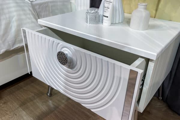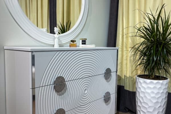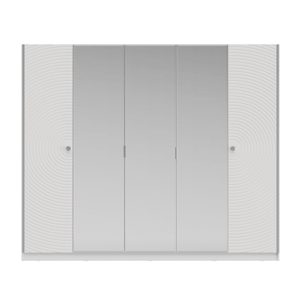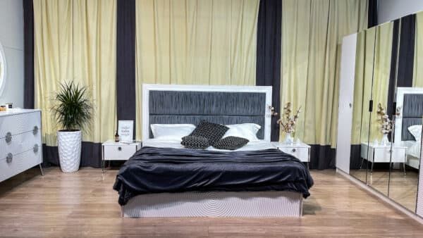 Размеры: Шкаф 5-ти дверный -ш: 2500 мм, г: 600 мм, в: 2100 мм Кровать – ш: 2070 мм, г: 2050 мм, в: 1340 мм Тумба – ш: 526 мм, г: 400 мм, в: 441 мм Комод – ш: 1060 мм, г: 450 мм, в: 951 мм Зеркало -ш: 1060 мм, г: 34 мм, в: 1060 мм