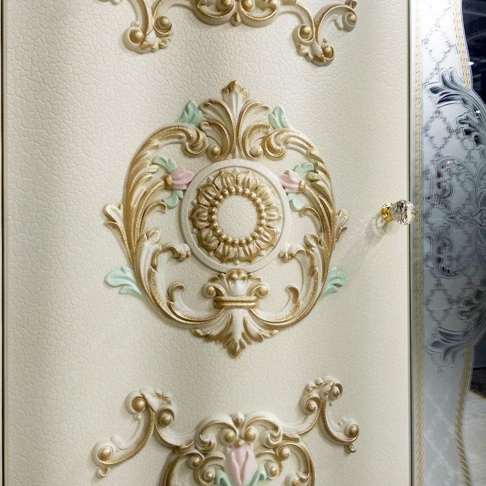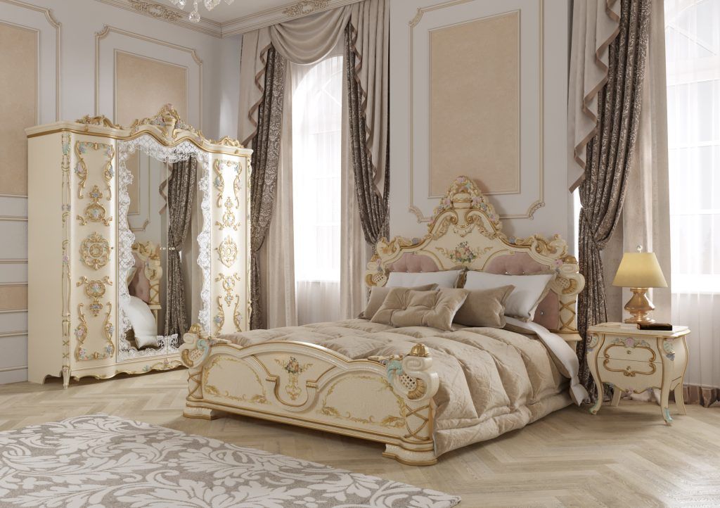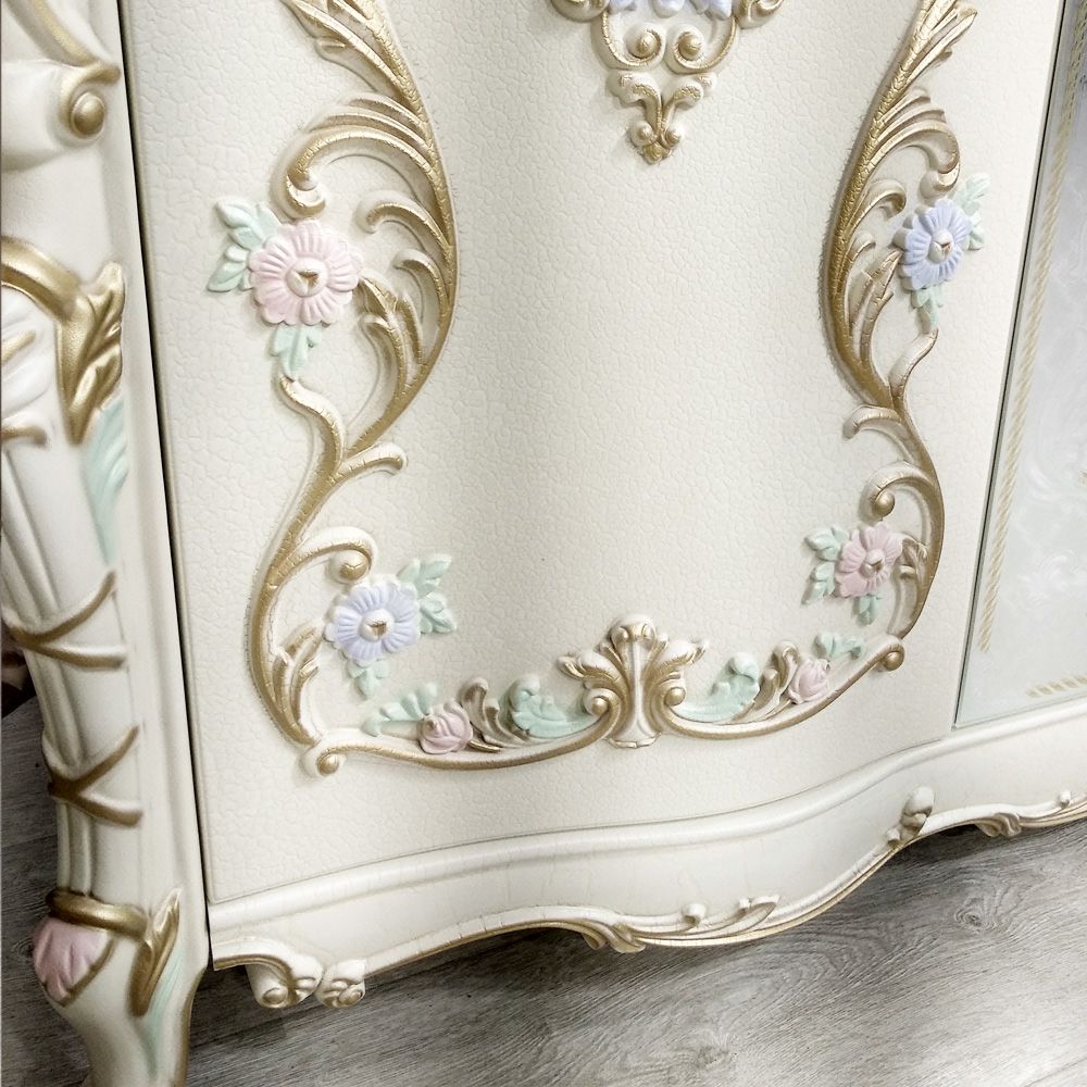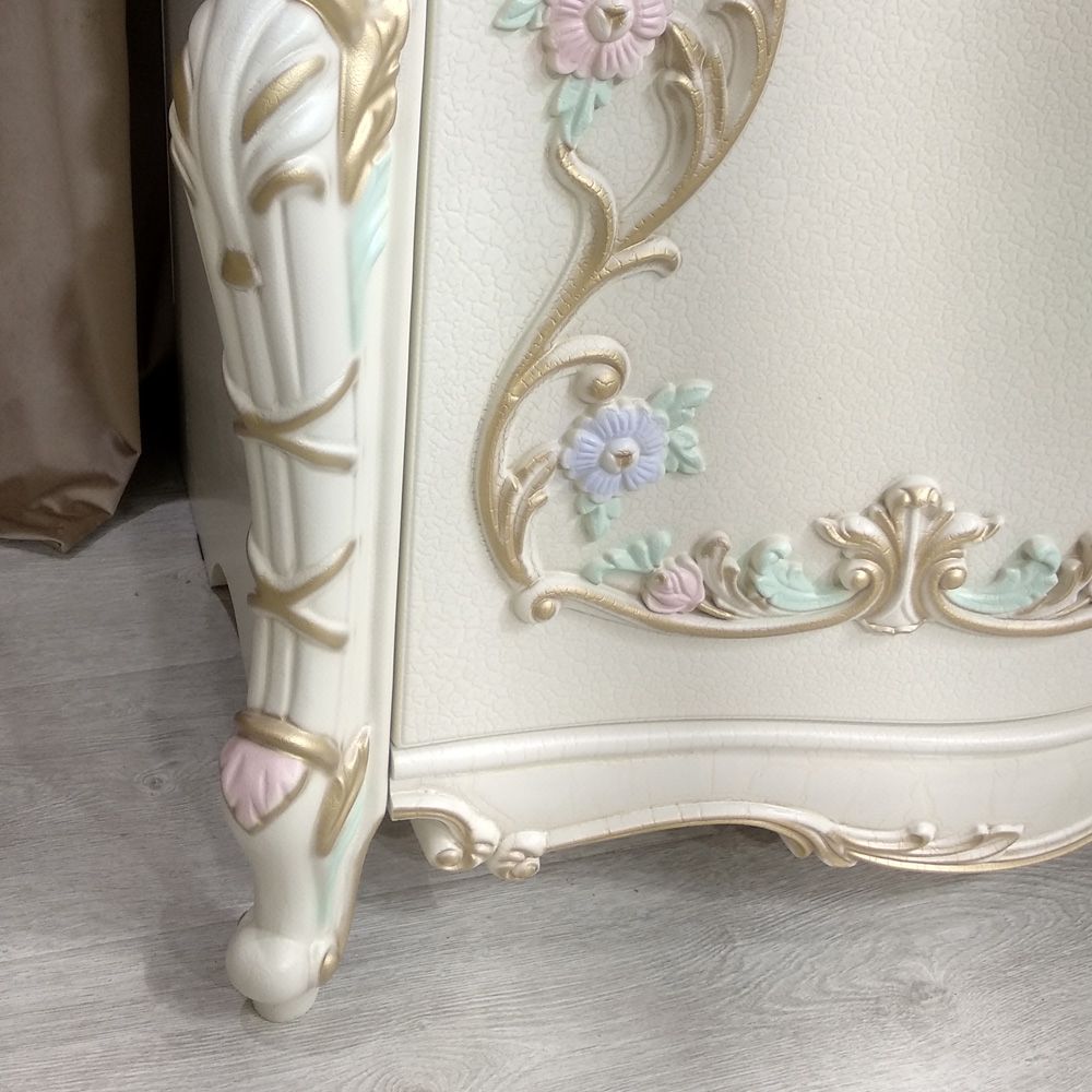 Кракелюр (в переводе с французского «Craquelure» – трещина). Уникальная технология пятислойного покрытия итальянскими лаками, ручная роспись резных элементов в стиле барокко придают Вашей мебели вид антикварного предмета.