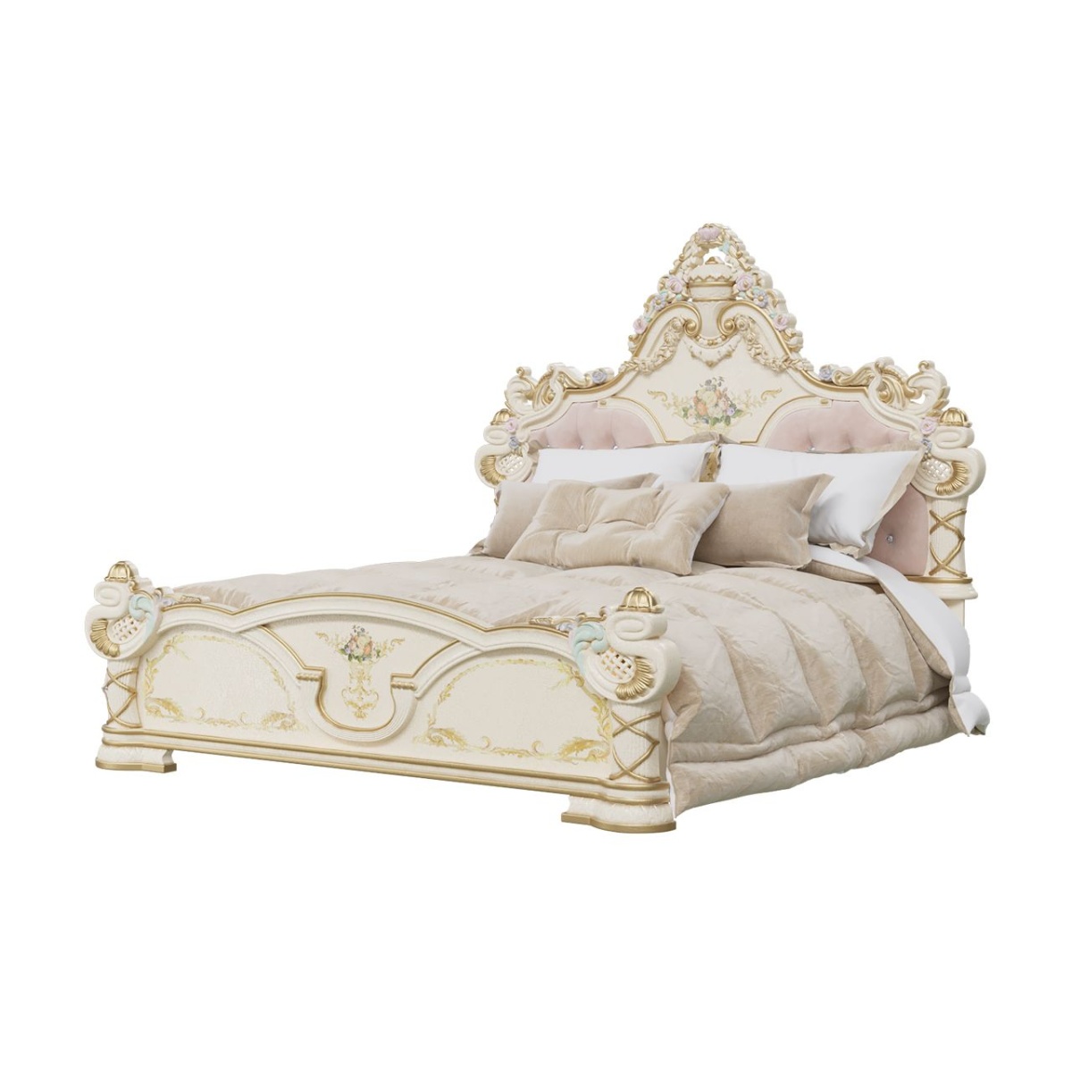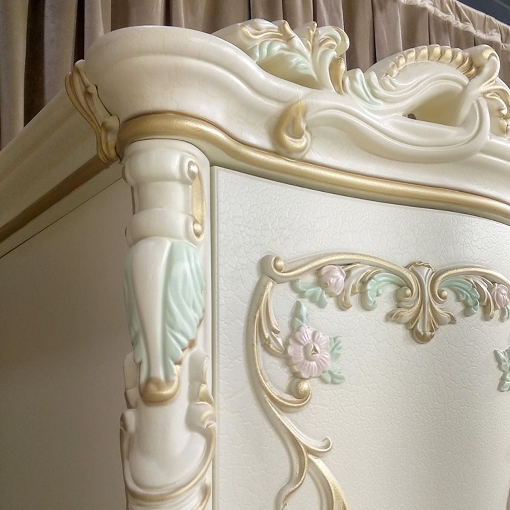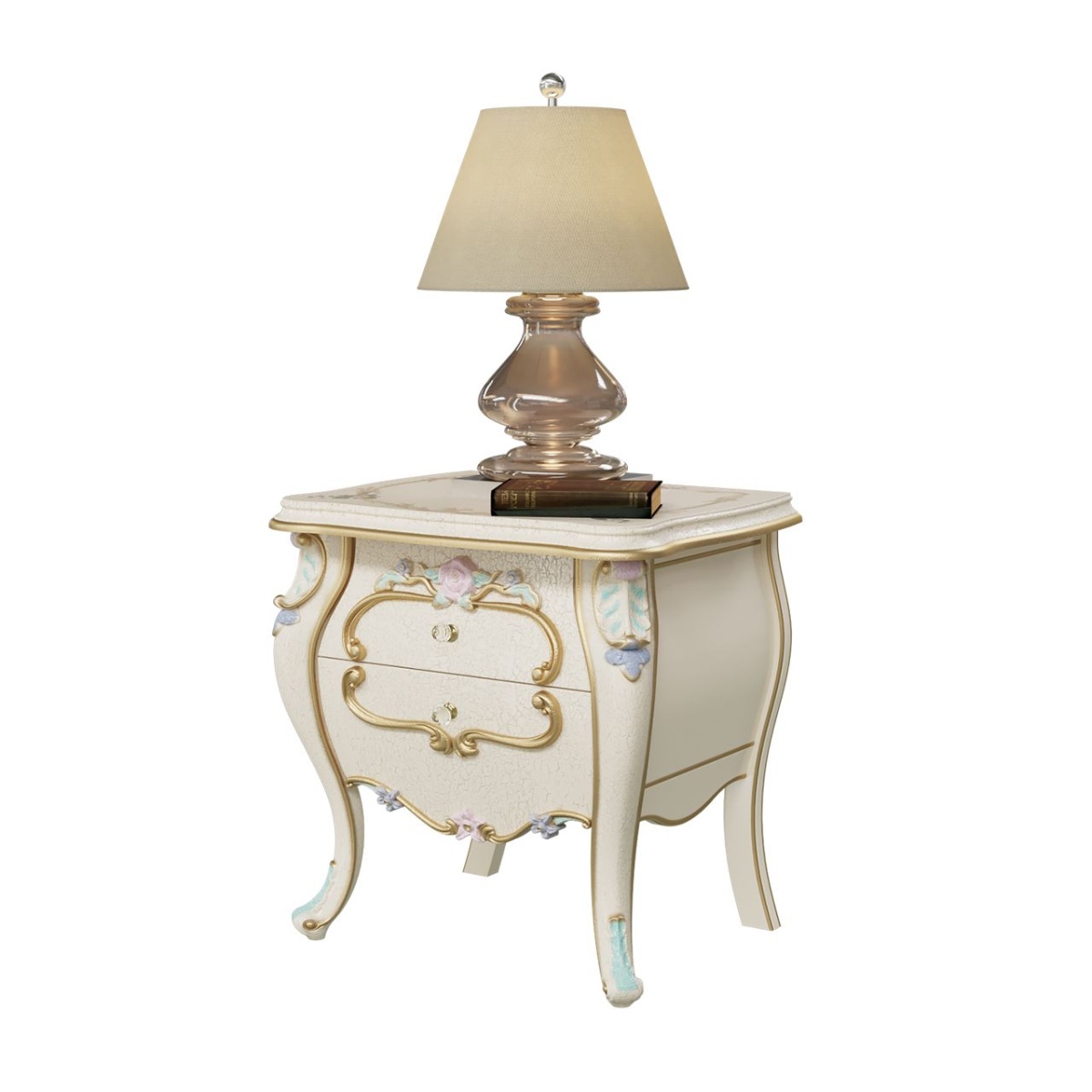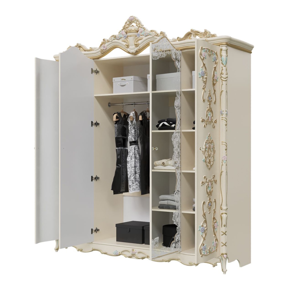 Кракелюр (в переводе с французского «Craquelure» – трещина). Уникальная технология пятислойного покрытия итальянскими лаками, ручная роспись резных элементов в стиле барокко придают Вашей мебели вид антикварного предмета.