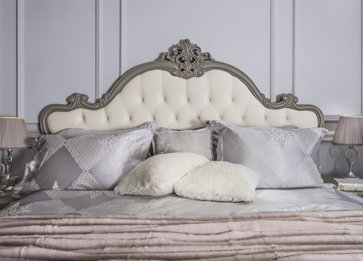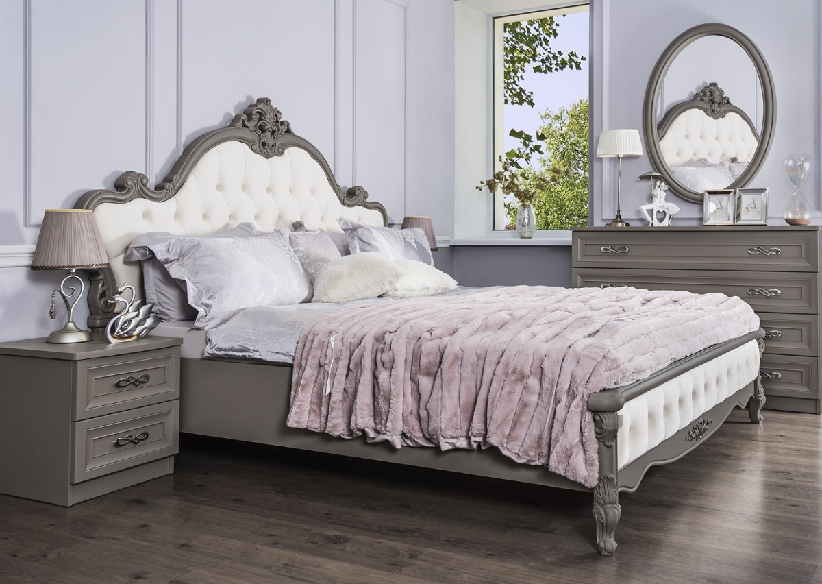 Изголовье: Багет ППУ эмаль серый камень матовый, вставка Велюр молочный (Мокко серый камень) с каретной стяжкой, пуговицы обтянуты велюром;