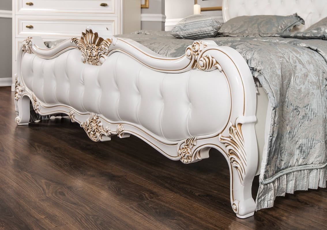 Изножье: Экокожа белая матовая, каретная стяжка, пуговицы из экокожи;