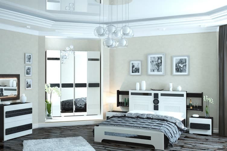 В комплект входят: — СП-03 Шкаф 3-дверный с 1 зеркалом; — СП-13 Комод; — СП-08 Тумба прикроватная — 2 шт.; — СП-12 Зеркало без подсветки; — СП-06 Кровать 2-спальная. Ортопедическое основание приобретается отдельно. Цена — 9 000 руб. Цвет: жемчужный лен/венге шелк