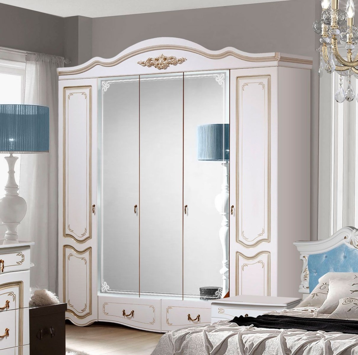 Спальный гарнитур Рим 5.2П с голубым изголовьем включает в себя следующие предметы: