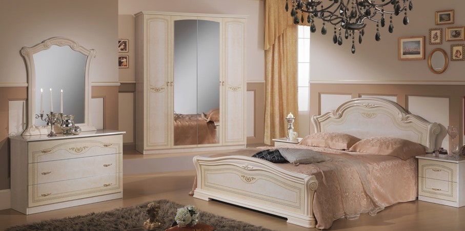 В комплект входят: кровать двуспальная 160×200 см., шкаф 4-дверный, тумба прикроватная 2 шт., комод, зеркало в раме.