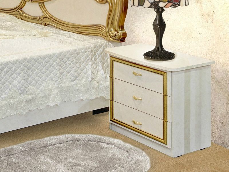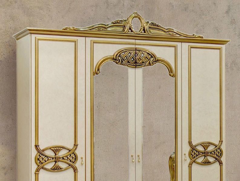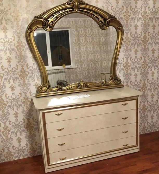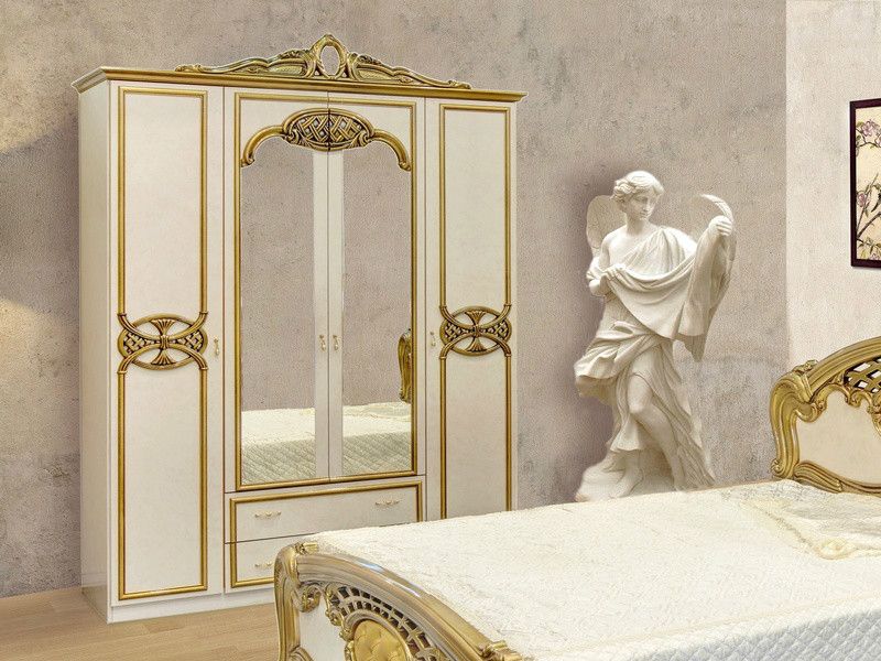 В комплект входят: кровать двуспальная 160×200, шкаф 4-дверный, тумба прикроватная 2 шт., комод с зеркалом.