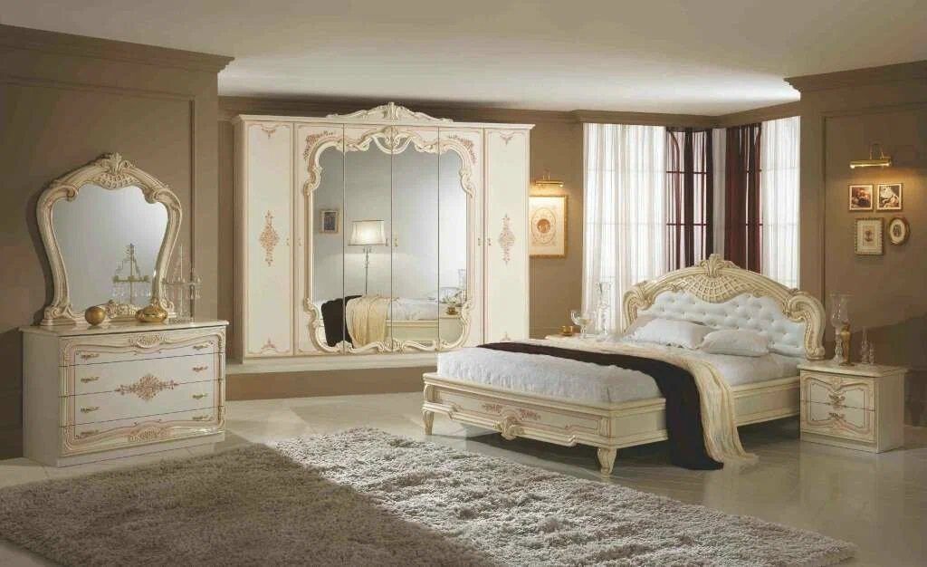 В комплект входят: кровать двуспальная 160×200 см., шкаф 6-дверный, тумба прикроватная 2 шт., комод с зеркалом.