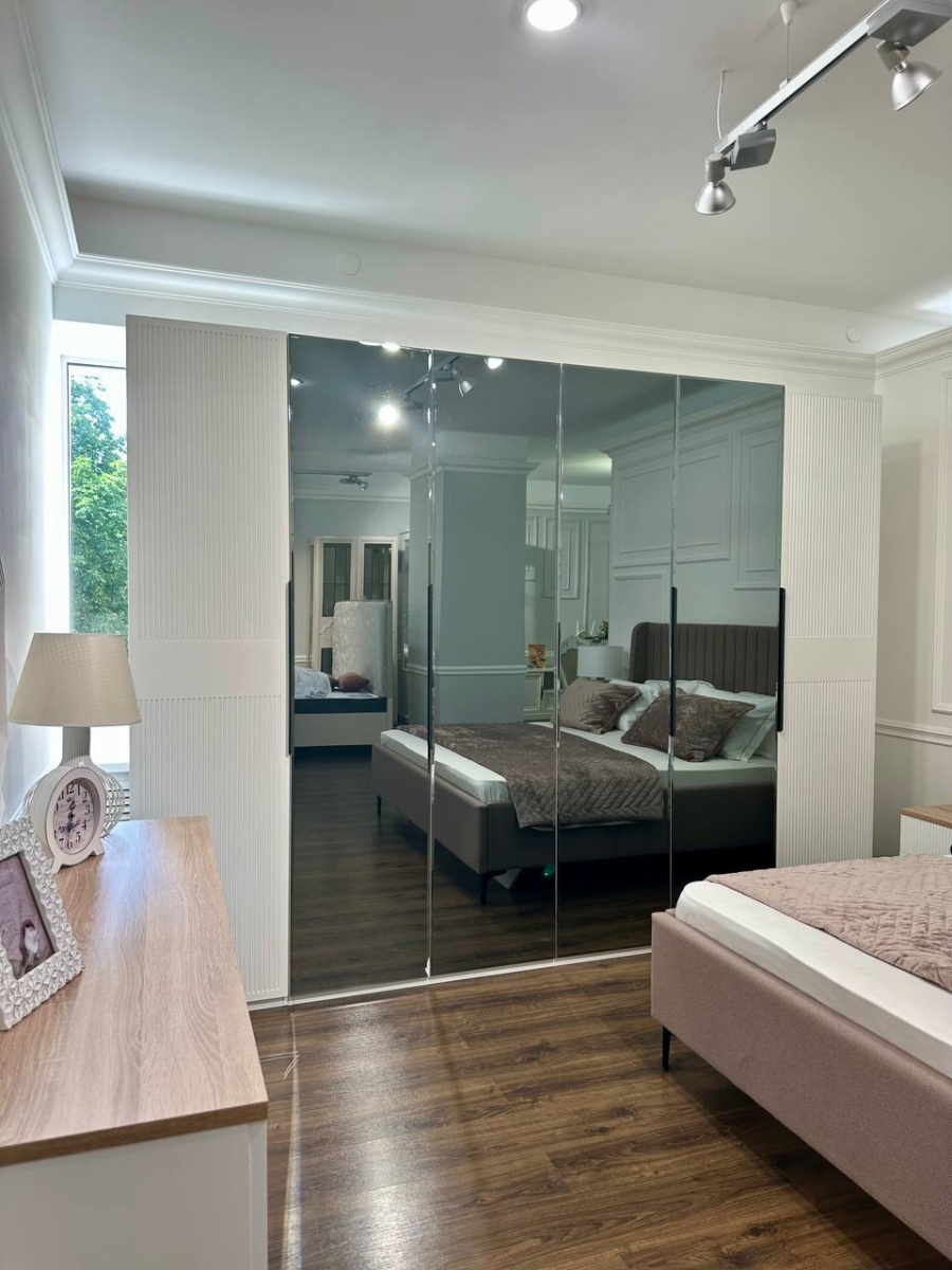 Зеркало: 4 зеркала с фацетом, приклеивается по технологии полного закрашивания полотна клеем, дымчатая тонировка графит