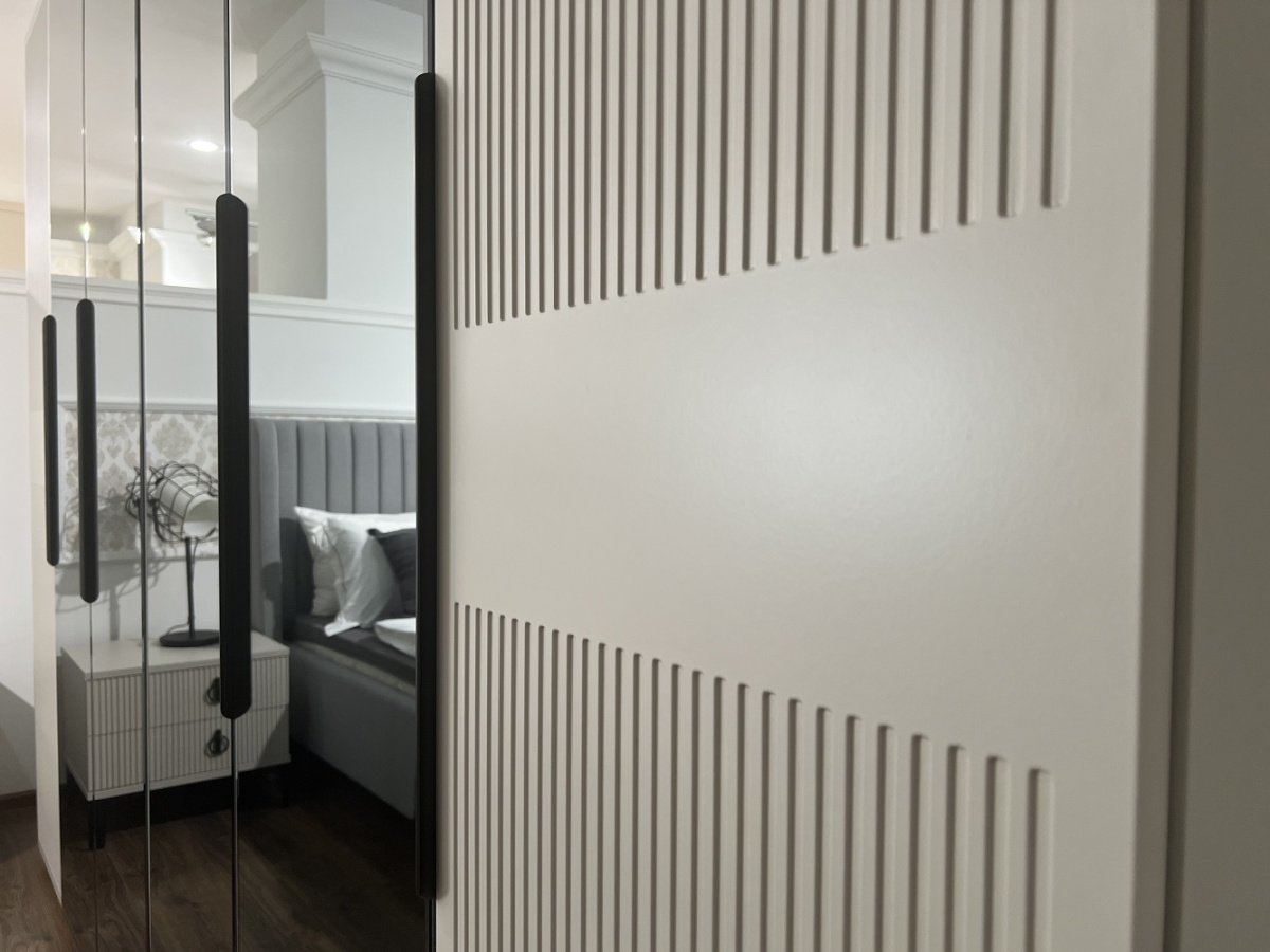 Особенность: Фасады шкафа раздвижные, система открывания «складная».