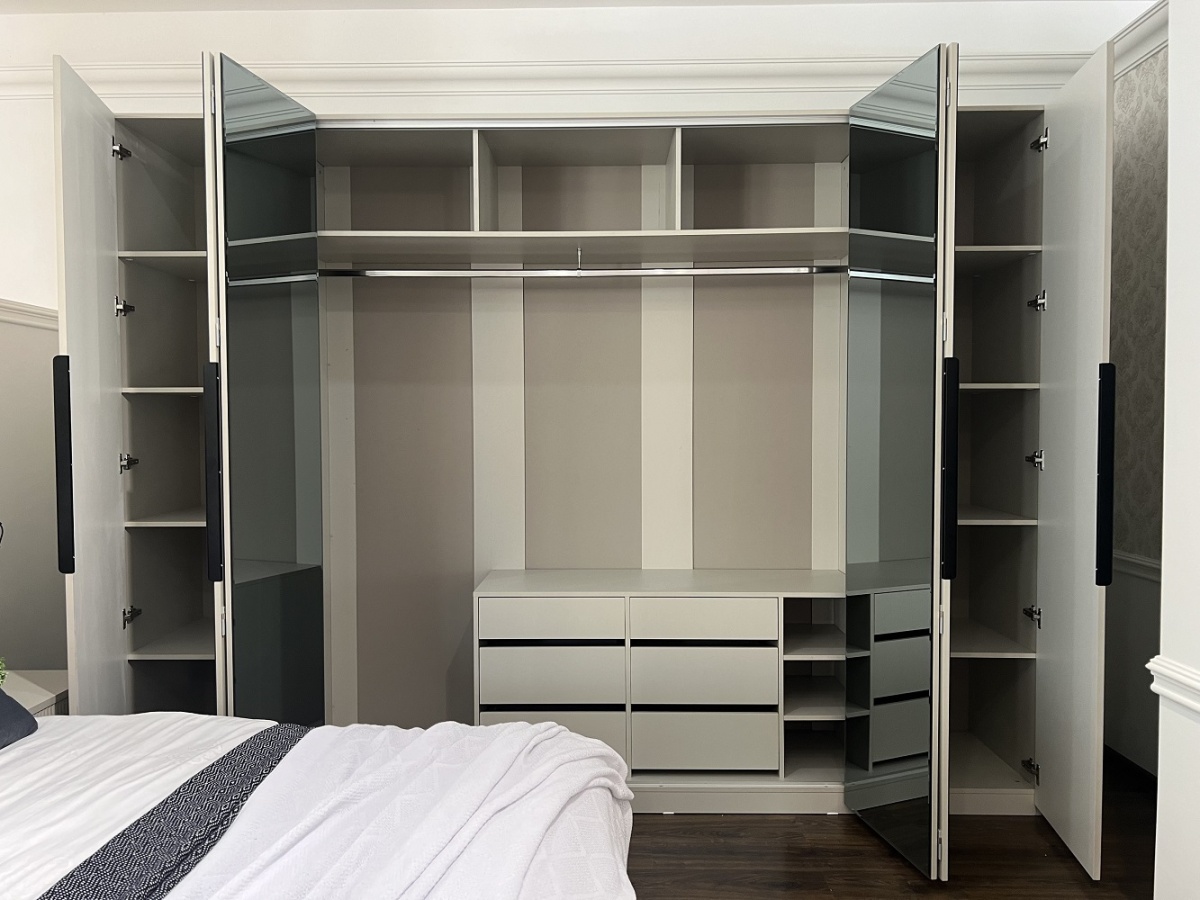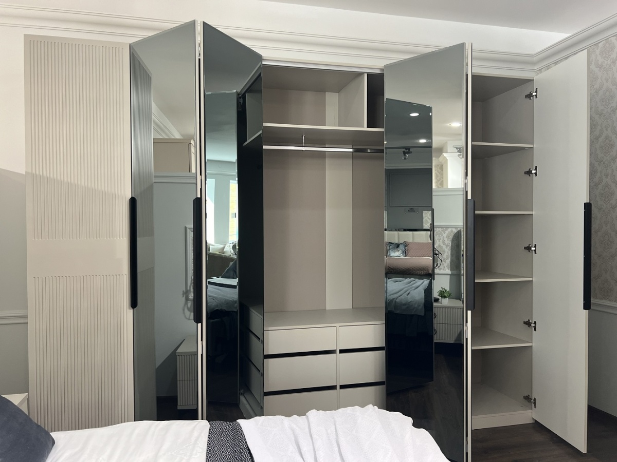 Особенность: Фасады шкафа раздвижные, система открывания «складная».