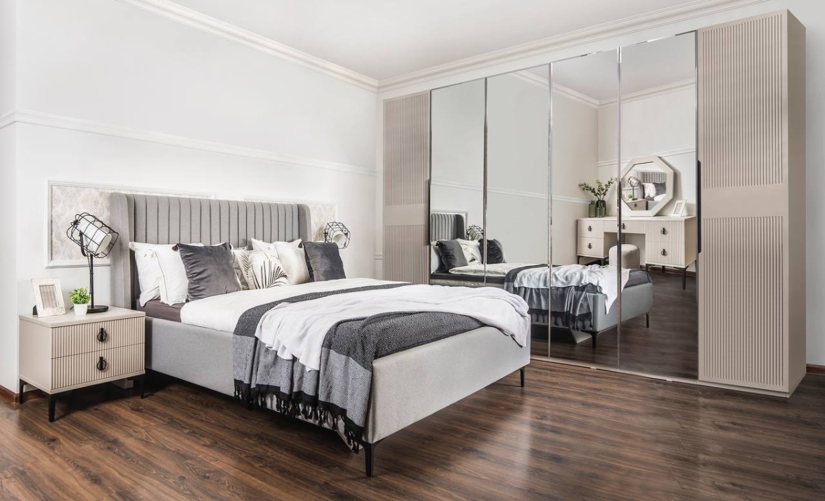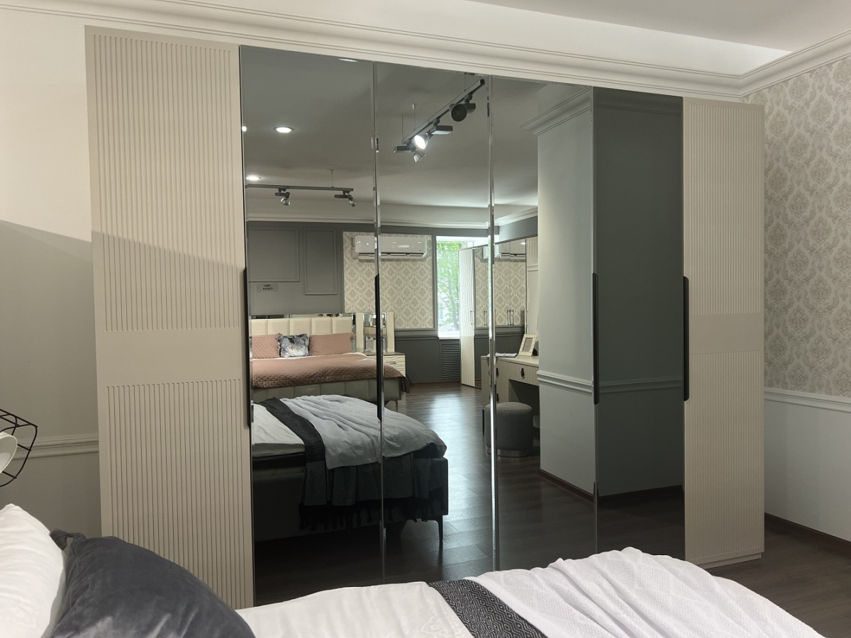 Зеркало: 4 зеркала с фацетом, приклеивается по технологии полного закрашивания полотна клеем, дымчатая тонировка графит
