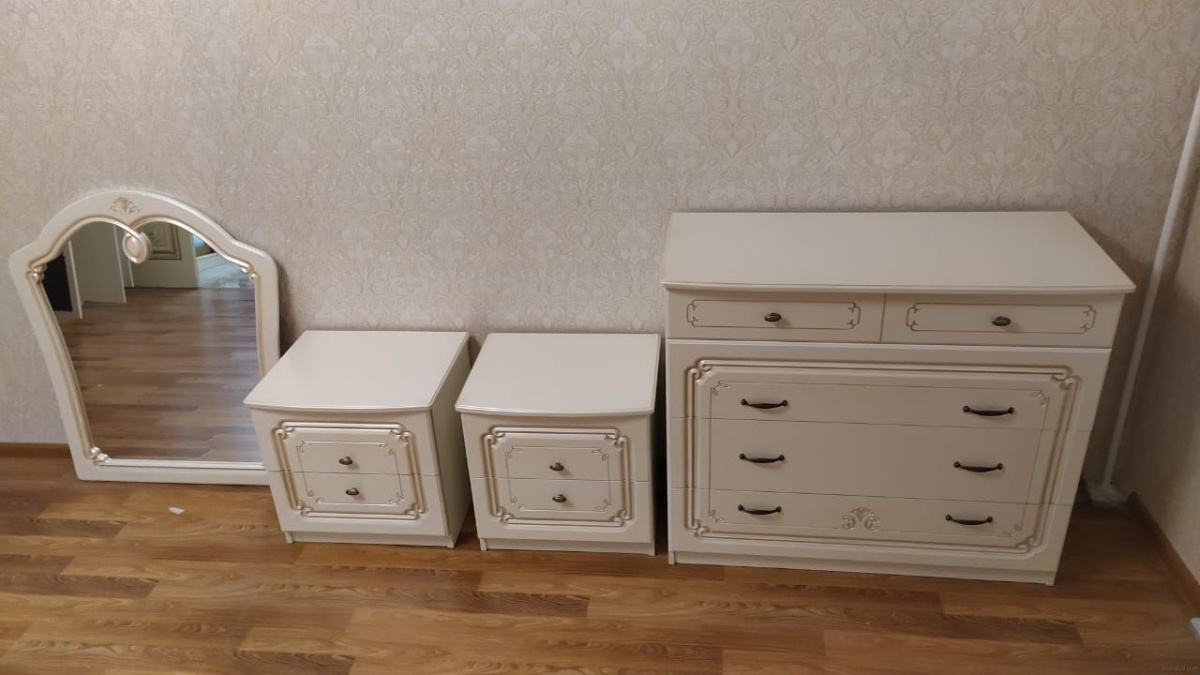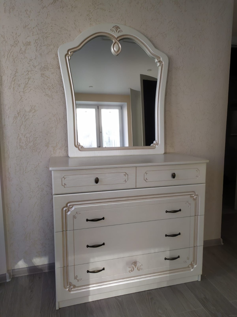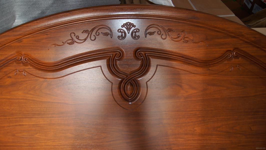 Все фасадные части изготовлены из одностороннего ламинированного МДФ облицованного пленкой ПВХ. На фасадные части наносится патина. Покрывается лаком. Каркасные части изготовлены из ламинированного ДСП. Кровать комплектуется настилом. Цвет фасада – «орех» или «жемчуг».