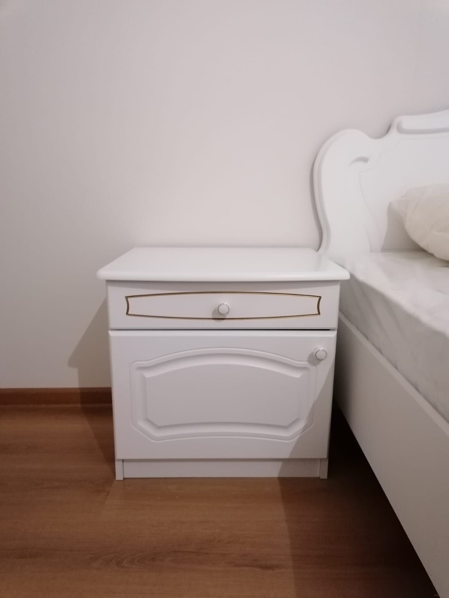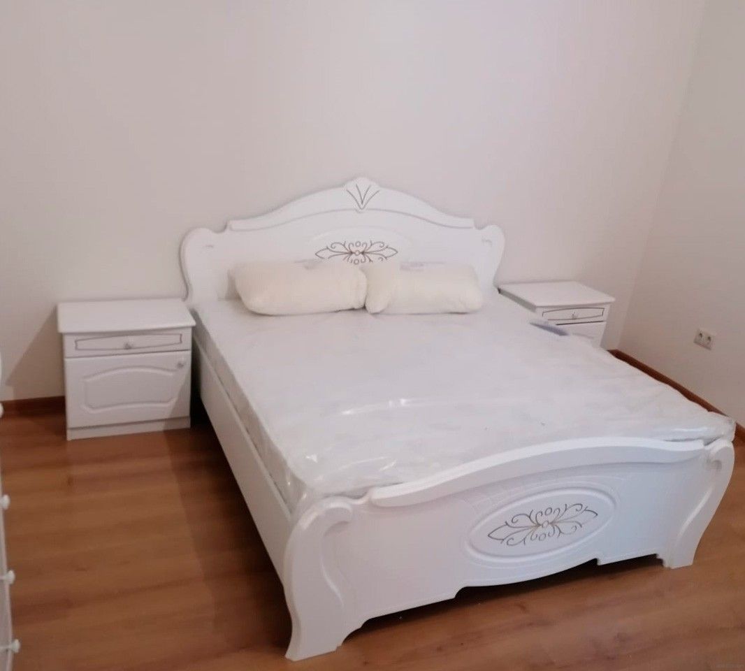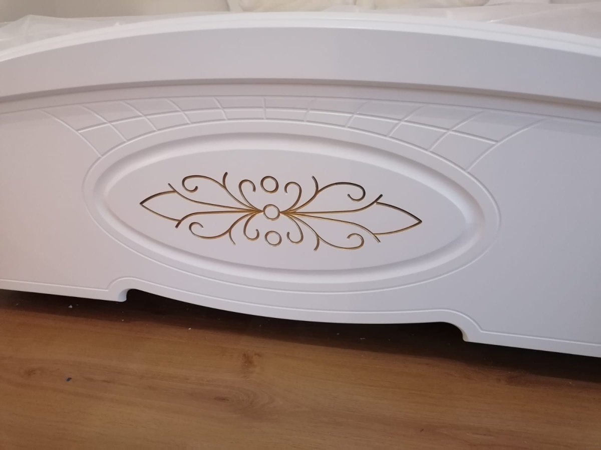Все фасадные части изготовлены из МДФ ламинированного. На фасадные части наносится патина. Покрывается лаком. Каркасные части изготовлены из ламинированного ДСП. Кровать комплектуется настилом (решеткой основанием), но не комплектуется матрасом. Цвет – «орех» и «белая эмаль».