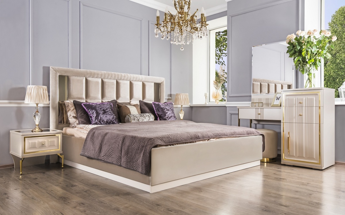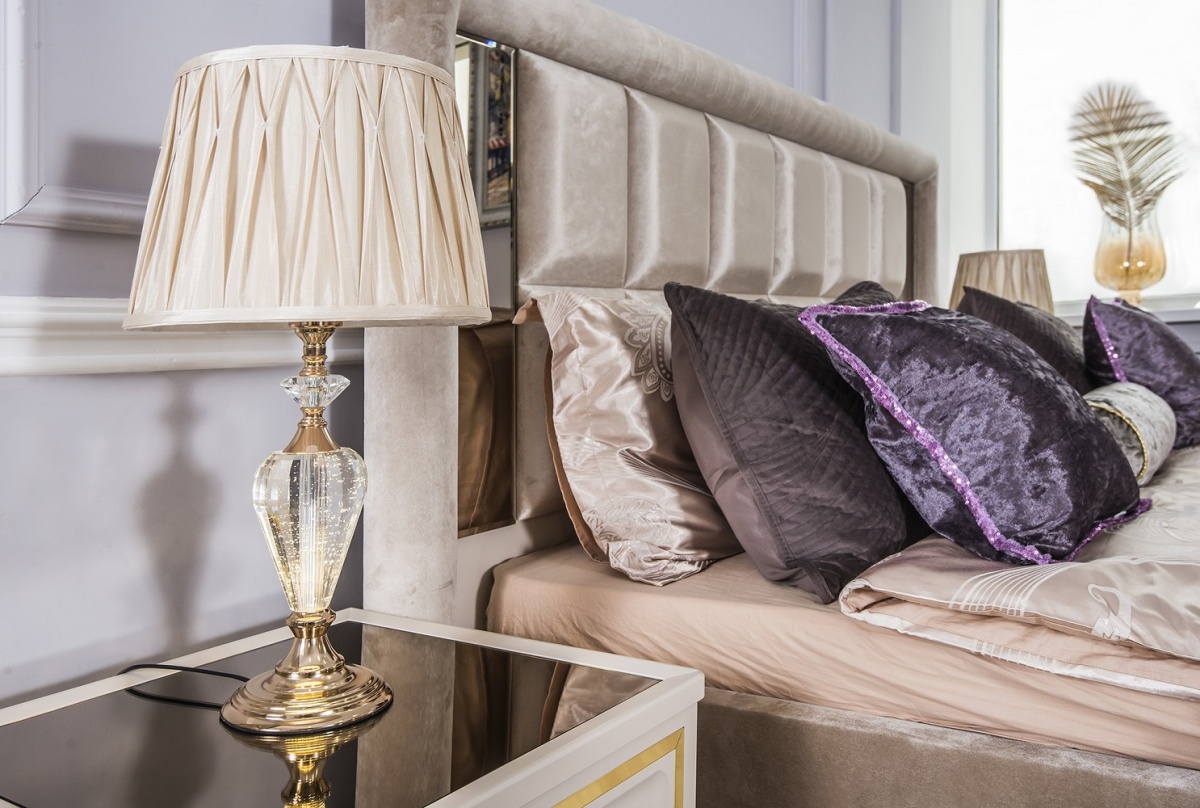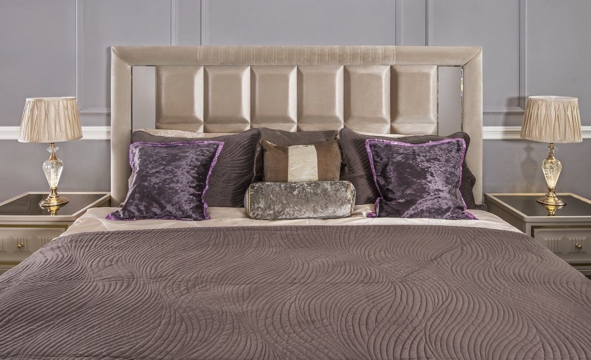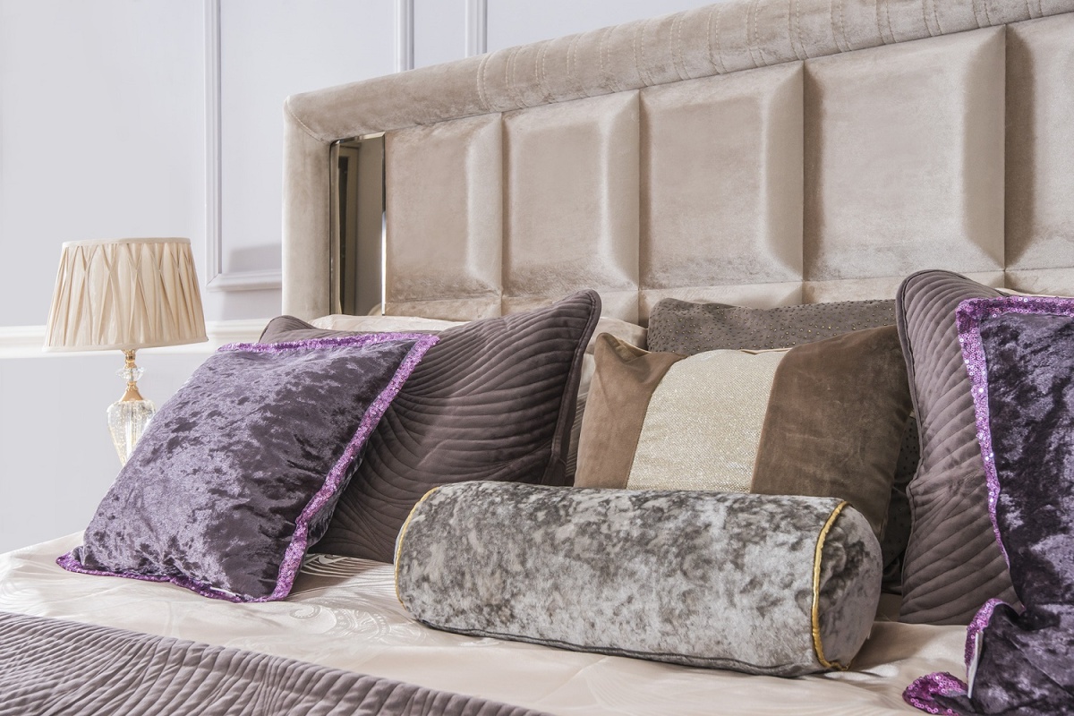 Изголовье: Спинка в велюре, по бокам зеркальные вставки с фацетом, с тыльной стороны кровати (сзади) материал ЛДСП;
