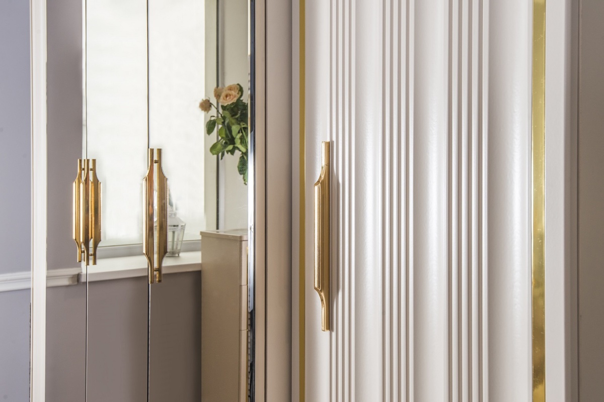 Фасад: МДФ с фрезеровкой и вставкой из пластика под латунь;